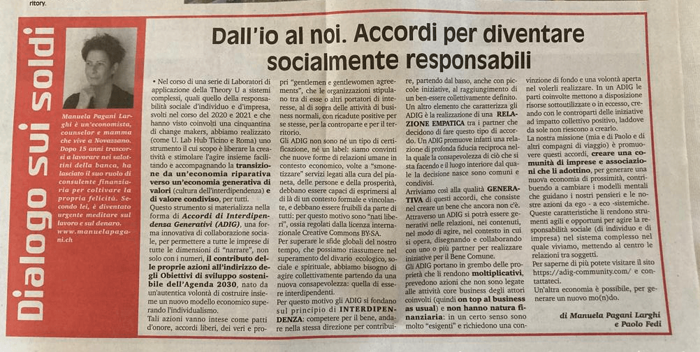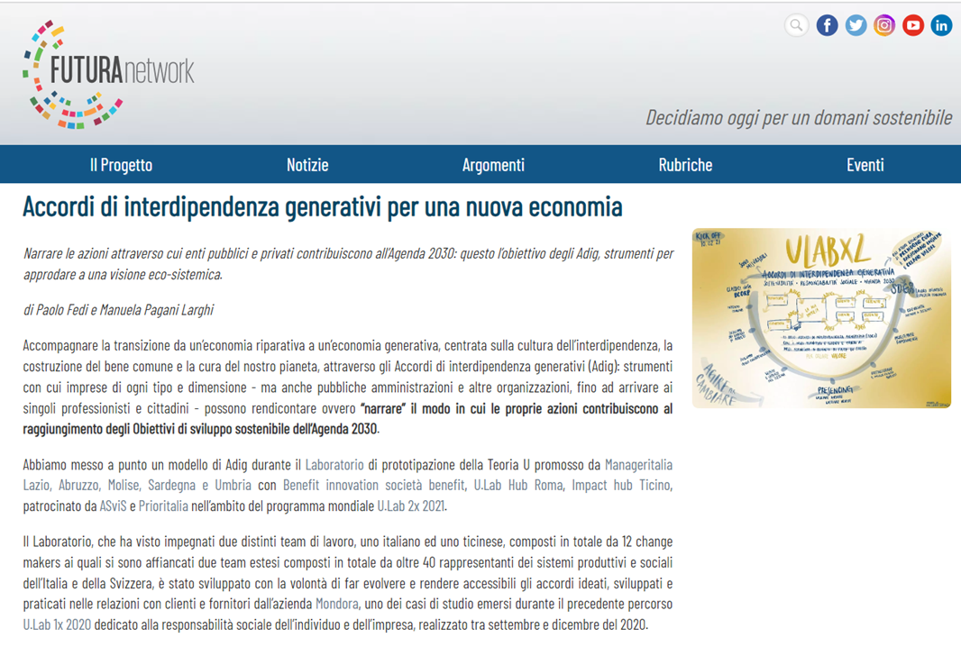 "Paolo Fedi and Manuela Pagani Larghi share their experience with Theory U and the development of the Generative Interdependence Agreements (ADIG “Accordi Di Interdipendenza Generativa” in Italian): tools with which companies, public services, individual professionals and citizens can make themselves promoters of multiplicative impact initiatives and report or “narrate” the way in which their actions contribute to the achievement of the Sustainable Development Goals of the 2030 Agenda. Relying on the sharing of non-monetary resources, the Generative Interdependence Agreements represent the intersection of three values: interdependence, trust and generativity. ...."