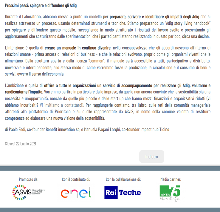 - valutazione d'impatto delle iniziative definite negli ADIG secondo i principi e il framework del Bilancio dell'Economia del Bene Comune;